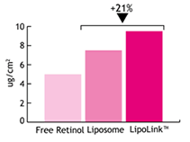 LipoLink™ est un liposome uni-lamellaire innovant où l’ingrédient actif n’est pas encapsulé mais directement lié aux phospholipides par des liaisons de Van der Waals. Par conséquent, LipoLink™ se comporte comme un vecteur actif, véhiculant l’ingrédient à travers la peau jusqu’à son site d’action. Protégés par LipoLink™, les actifs sont moins sensibles à l’oxydation et à d'autres formes de dégradation.